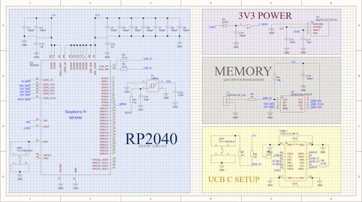 首先你必須準備下列工具,焊盤、電烙鐵、焊膏、刮刀,接著你必須進行PCB設計,主要分成四個部分,第一個是設置RP2040 ( RaspBerry Pi Pico首款自研晶片),第二個是內存晶片,這個控制器有點不同,因為它需要一個外部存儲芯片來加載程序代碼,第三個是電壓調節器,該 MCU (MCU是微控制單元,能把中央處理器CPU頻率與規格做適當縮減,並將記憶體、計數器、USB、A/D 轉換) 需要 MCU 自身內部生成的 1、1V 和必須通過穩壓器從外部提供的 3、3V,第四個是使用Type C連接。