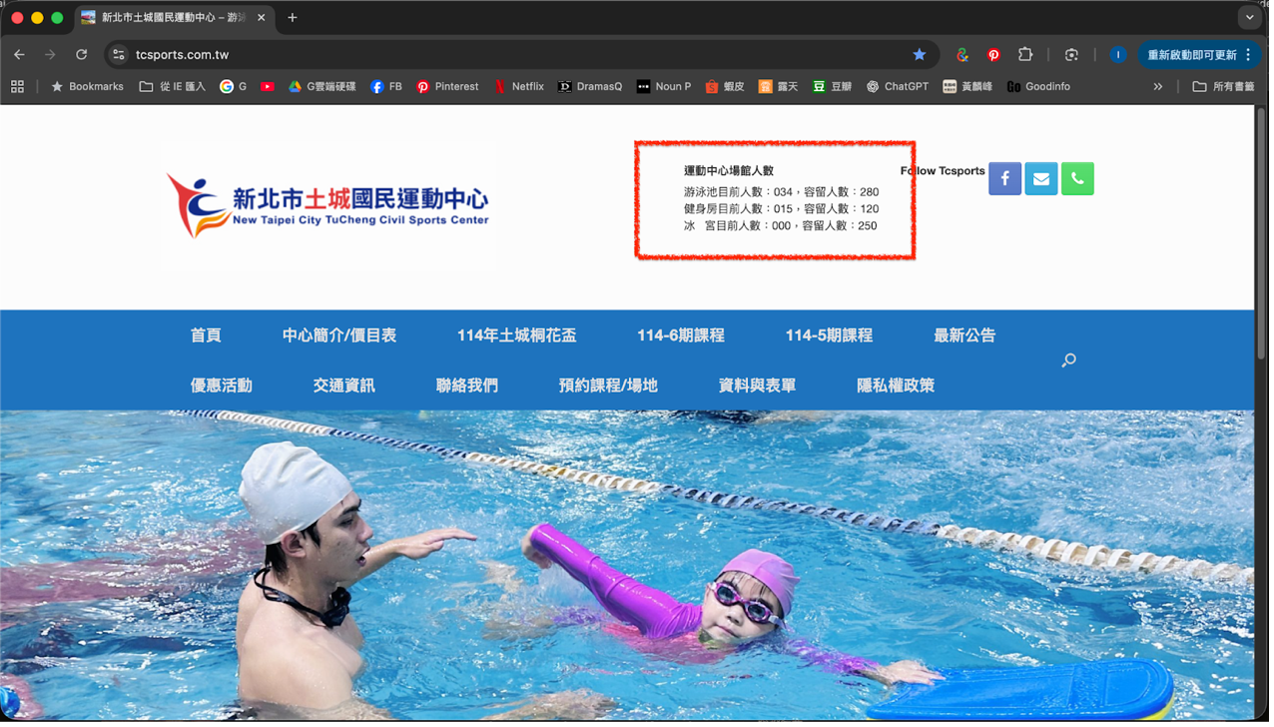 運動中心的官網首頁會刊登即時的使用人數(紅框)