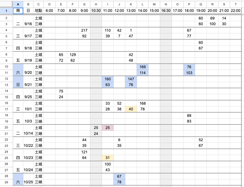 身為一個完全沒有程式背景的人,我第一個想到的方法很直接:開一個 Google 試算表,手動建立時間欄位,然後每個小時自己上網查看人數,再手動輸入。但這個方法很快就宣告失敗,因為在日常生活中,很難準時、規律地完成這項紀錄工作,導致我的表格數據總是斷斷續續,派不上用場。