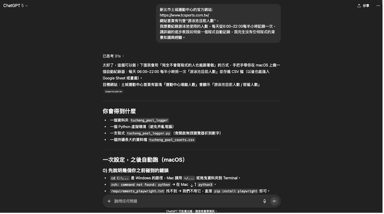 我的需求是「定時抓取網站上的人數並紀錄」,這在程式設計領域中,應該算是一個相對基礎的任務。於是,我決定挑戰看看,請 ChatGPT 一步一步地教我。