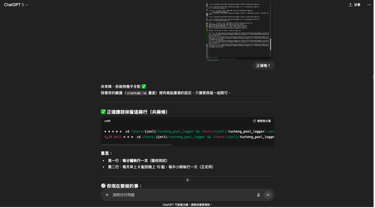 考量到我最終的目標是「每半小時紀錄一次」,這樣的測試週期太長。 ChatGPT 也很聰明地主動建議,先將程式改成「每分鐘紀錄一次」,以便快速驗證程式是否成功。這個調整確實很有幫助,我很快就在試算表上看到了自動填入的數字。