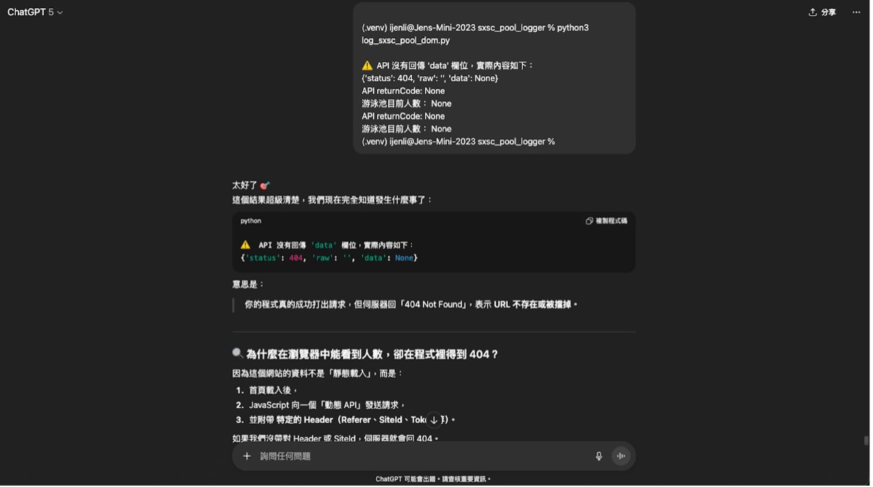 我試著用跟之前完全相同的流程,請ChatGPT教我製作第二支爬蟲。但這次,我陷入了無止境的錯誤迴圈。無論怎麼修改,程式始終無法正確抓取到數字。雖然ChatGPT每次都會針對錯誤提出解決方案,但問題就是無法被根除。在多次嘗試失敗後,我只好暫時放棄。這次的挫敗讓我意識到,當面對的狀況稍微複雜一些,單純依賴AI問答的Vibe Coding方式,可能會遇到瓶頸。