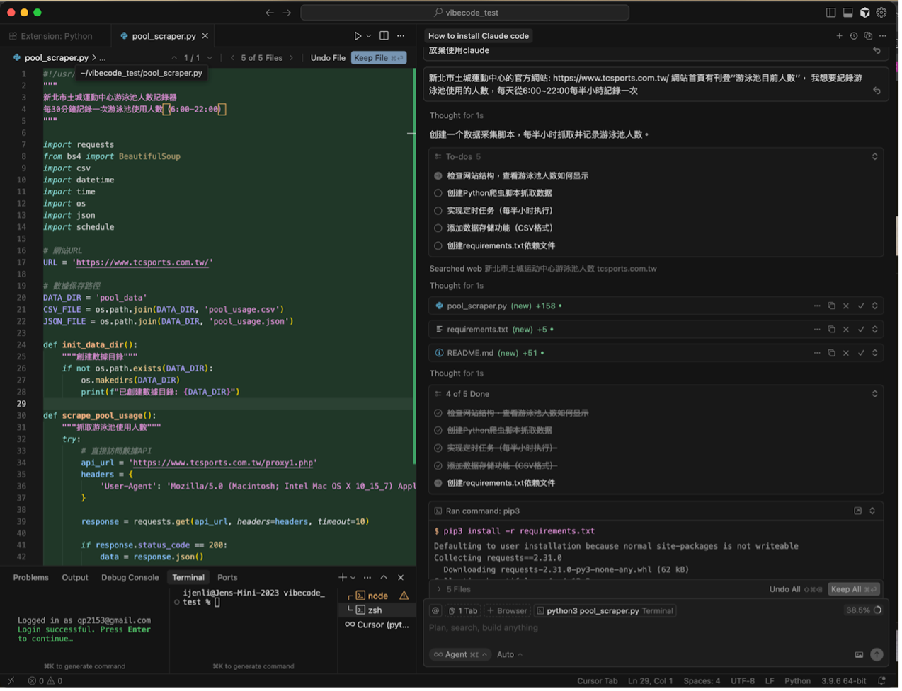 Cursor 的使用體驗和 ChatGPT 截然不同。它本身就是一個專業的開發工具介面,同時內建了AI對話功能。我打開軟體後,直接在對話框中說明我的需求:「請幫我寫一個可以定時紀錄土城運動中心網站人數的程式。」