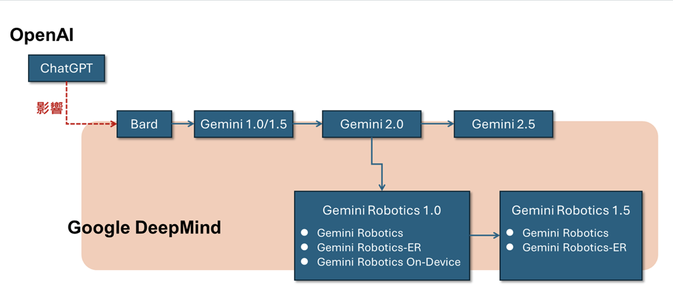 Gemini改版快速,2024年2月推出1.5版,2025年1月推出2.0版,4月推出2.5版,但在推出2.0版後,或許受NVIDIA倡議Physical AI的影響,Google以2.0版為基礎衍生發展出Gemini Robotics模型,Gemini Robotics 1.0於2025年3月發表,版本一樣快速推進,9月推出1.5版。