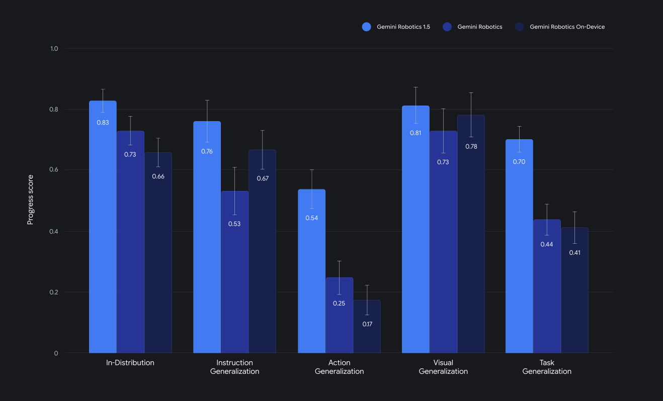 無論是Gemini Robotics或Gemini Robotics-ER,Google DeepMind團隊(即Gemini Robotics開發者)為了彰顯其1.5新版模型的優異性,均端出了標竿測試數據,例如Gemini Robotics 1.5版比此前的1.0版、On-Device版(2025年6月推出的一個本機端版本,優點是不用連網,缺點是表現較受限)更好,或者Gemini Robotics-ER在具身推理學術標竿測試上居於領先。
