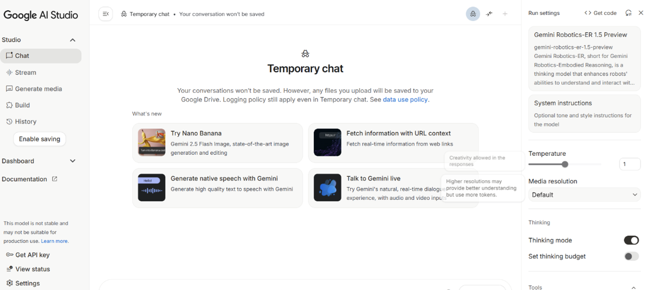 至於Gemini Robotics-ER 1.5因為是多模態進、文字出,所以Google開放可直接線上體驗,可以直接到Google AI Studio(簡稱AIS)體驗