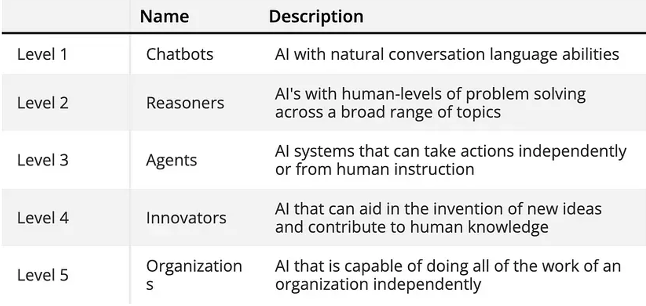 AGI其實難以一步實現,Gemini Robotics也只是真實物理層面的AGI,而非全方位的AGI,OpenAI執行長Sam Altman提出實現AGI的五步驟,其中即包含推理(Reason)、代理(Agent)技術。