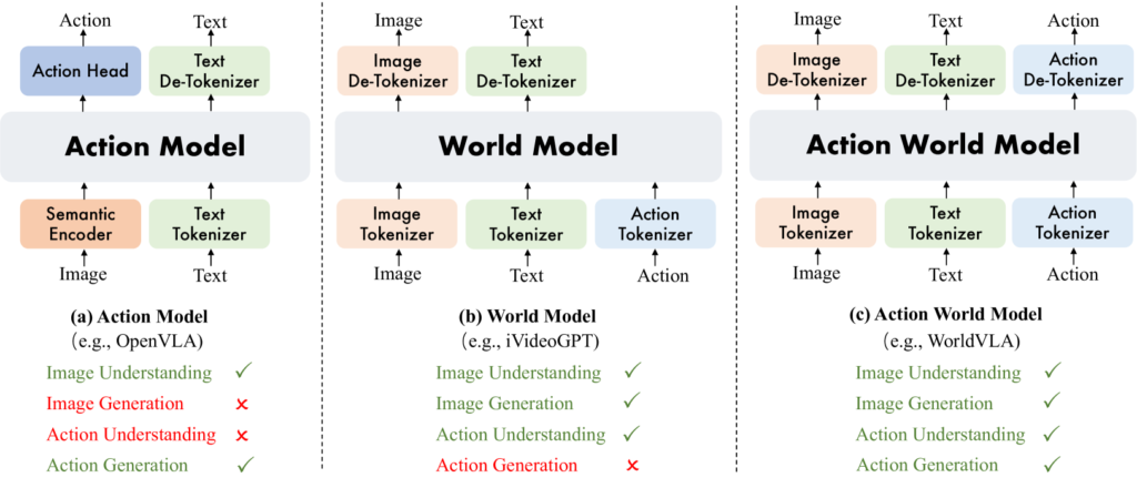 (a)動作模型基於圖像理解生成動作;(b)世界模型基於圖像和動作理解生成圖像;(c)動作世界模型統一了圖像和動作的理解和生成。(source