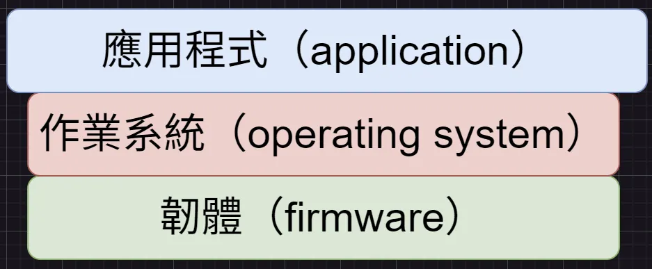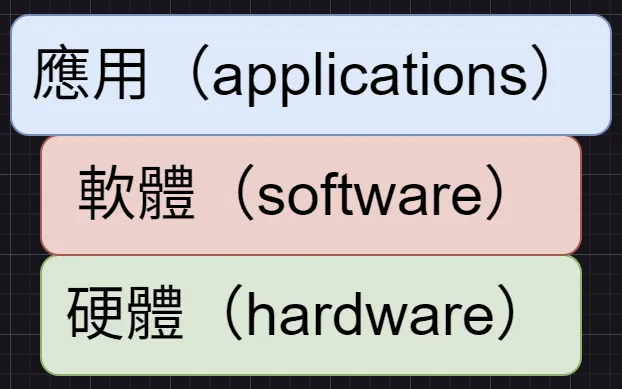 各種電腦系統(桌機、筆電、平板、手機、開發板、……)都是在既有的硬體(hardware)上開發各種軟體(software)來進行不同的應用(applications)(例如:超商的ibon機、金融機構的ATM、……),如圖1與圖2所示。
