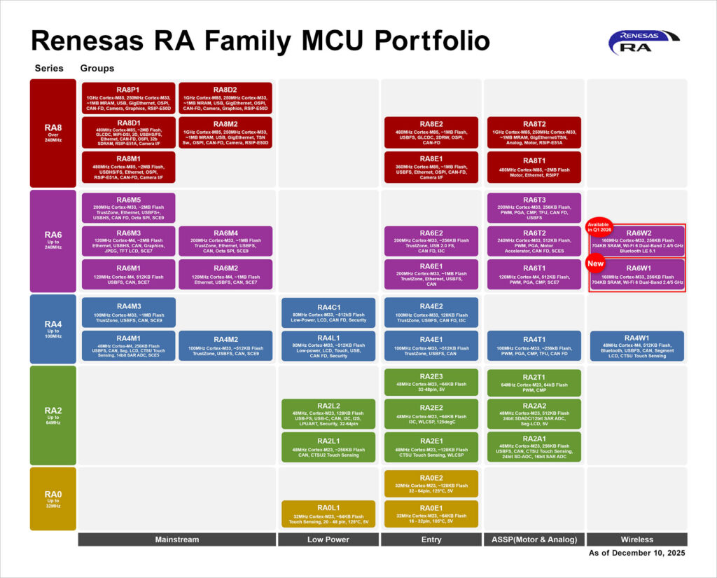瑞薩電子(Renesas)發表了RA6W1雙頻Wi-Fi 6無線微控制器(MCU),以及整合了Wi-Fi 6和藍牙低功耗(BLE)技術的RA6W2 MCU。這些連網產品旨在滿足智慧家庭、工業、醫療和消費性電子等領域對不斷線(always-connected)、超低功耗物聯網設備日益增長的需求。亦推出整合內建天線、無線協定堆疊和預驗證射頻連接的全整合模組,可加速產品開發。