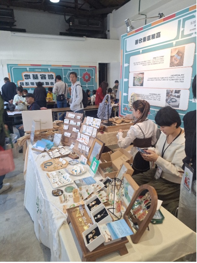 高分署的「創客小棧暨澎湖創客基地」則以地方特色出發,推廣永續設計與社會價值,展出結合「海洋×藝術×工藝」主題的作品,如運用UV樹脂調製海浪效果的幾何海洋項鍊,還有結合結合編織技術與支持婦女就業的手工編織鞋,以及將澎湖海岸海玻璃再製成的飾品,展現共創循環再利用的藍色經濟。