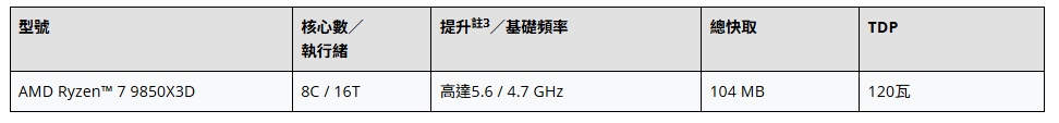憑藉8個高效能核心與16個執行緒,Ryzen 7 9850X3D處理器針對遊戲工作負載進行最佳化,提供最高效率、超低延遲與極致的畫面更新率。Ryzen 7 9850X3D提升頻率高達5.6 GHz註3,並配備104MB的快取記憶體總容量,確保在現代遊戲、串流及背景應用程式中提供流暢的遊戲體驗與多工處理效能。搭載AMD Ryzen 7 9850X3D系列處理器的系統將於2026年第1季開始由各大OEM、系統整合商(SI)及零售合作夥伴推出。