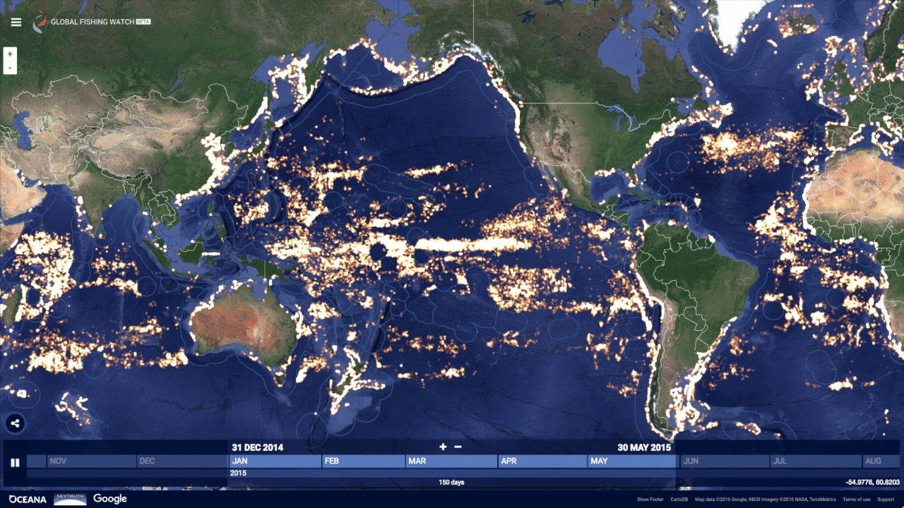 為了提高海上活動的透明度,2014年海洋保育組織Oceana、環境監測機構 SkyTruth以及Google展開合作,提出利用衛星資料追蹤漁船活動的計畫。利用船舶自動識別系統(AIS)所傳送的定位訊號,並結合機器學習分析船舶的速度、航向與行為模式,以判斷船隻是否正在進行捕撈活動。