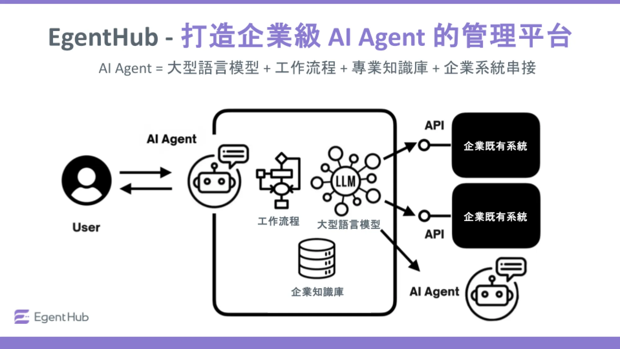 EgentHub 整合大型語言模型、企業資料庫,串接內外部系統,打造企業級 AI Agent 平台。(圖片來源:智慧方案)